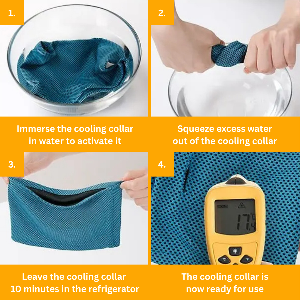 Simply soak the collar in water, wring it out, and place it in the refrigerator for 10 minutes — then it’s ready to use.