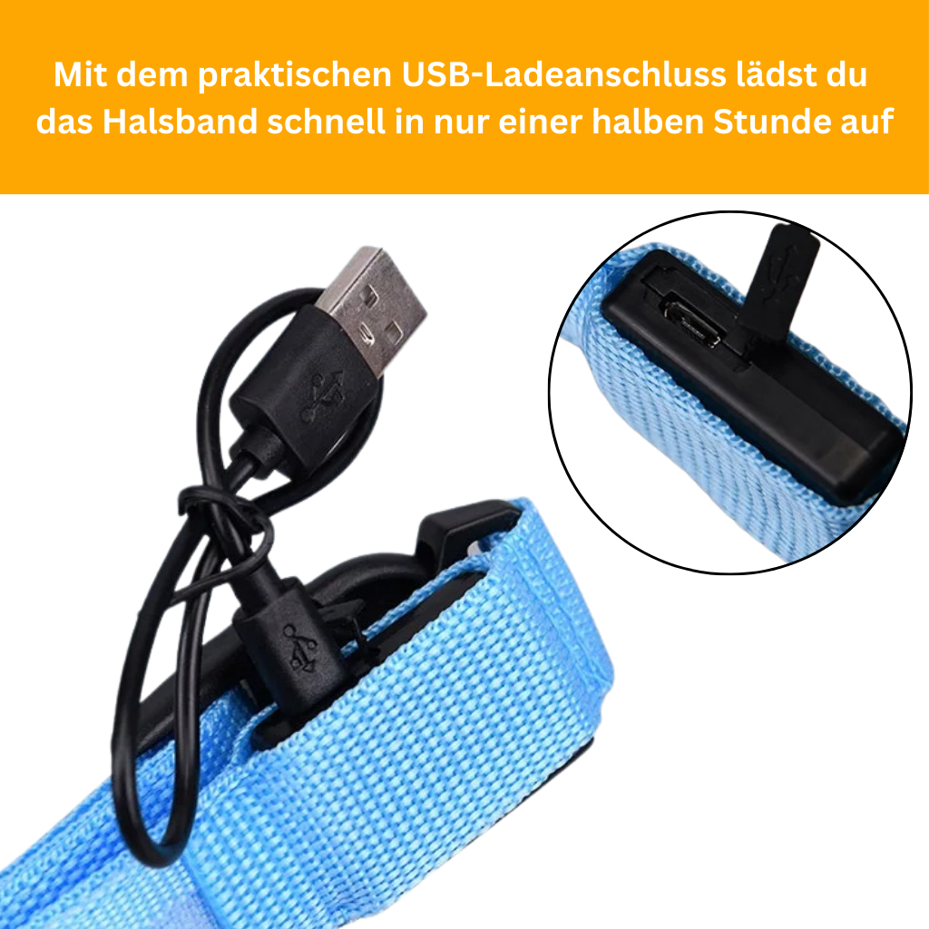 Das LED Leuchthalsband von FellFreund verfügt über einen praktischen USB-Ladeanschluss, der es ermöglicht, das Halsband in nur einer halben Stunde vollständig aufzuladen.