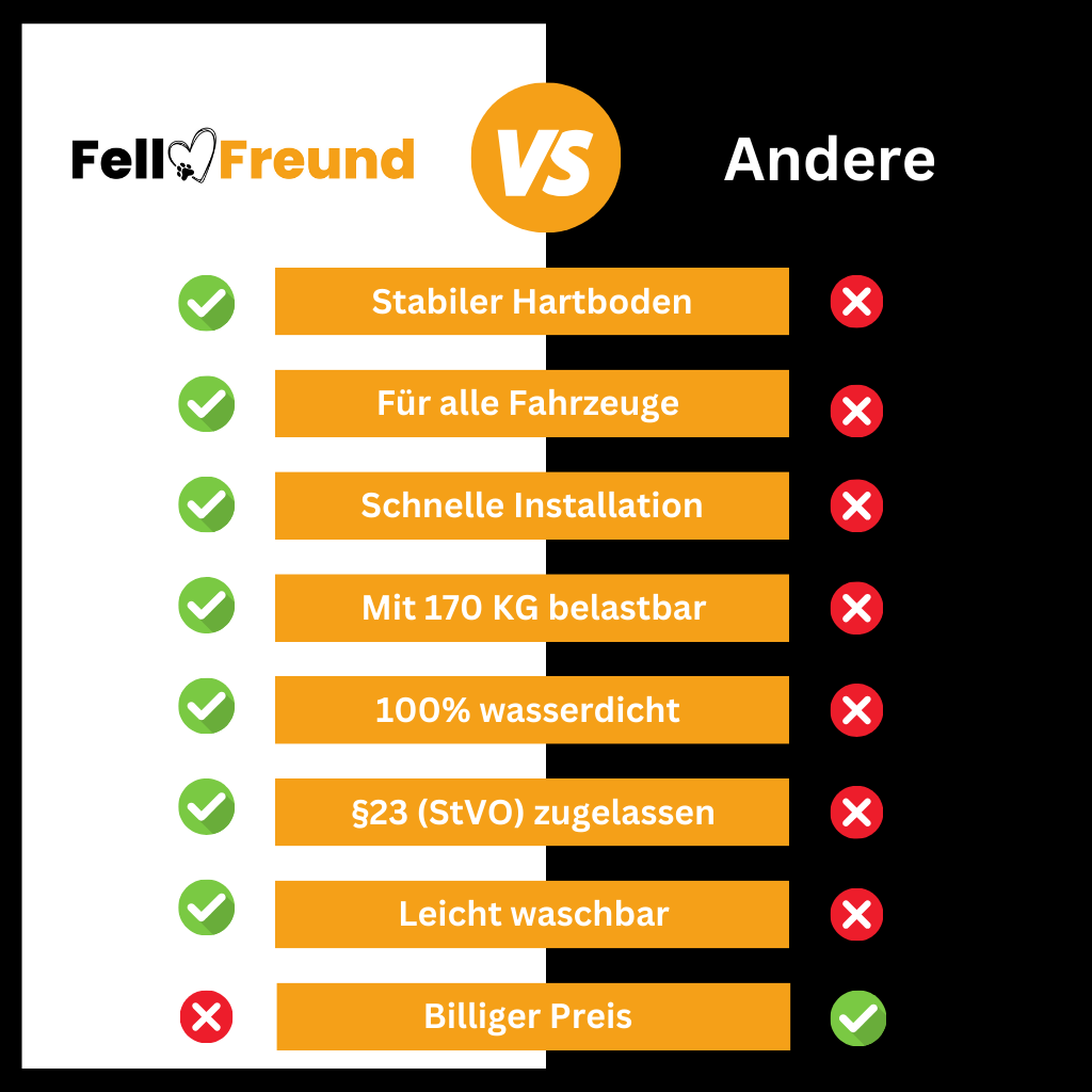 Der Hautgrund dafür sind die fehlende Hartplatten, welche den Platz für deinen Hund im Rückraum verdoppeln und zusätzlich dafür sorgen, dass dein Hund während der Fahrt nicht in den Zwischenraum fällt. Des Weiteren ist oben eine Tabelle, wo zu sehen ist, was unseren FellFreund Rücksitzschutz so besonders macht.
